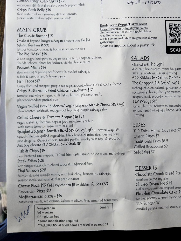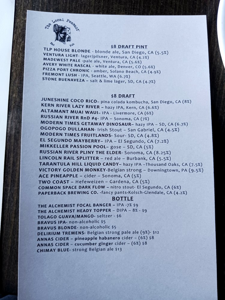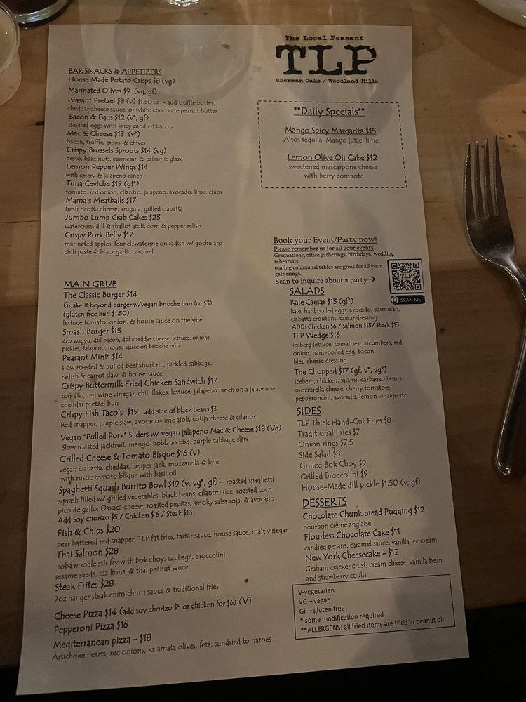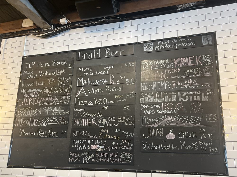 Introducing the menu at The Local Peasant - Woodland Hills, a gastropub offering a diverse range of New American cuisine. Start off with bar snacks like the Bacon and Eggs Deviled eggs or the Crispy Pork Belly with watermelon and tamarind. For the main course, try the Beyond Burger or the Crispy Buttermilk Fried Chicken Sandwich. Seafood lovers can indulge in the Fish and Chips or the Fish Tacos. Don't miss out on the refreshing salads such as the Blood Orange Belgium Endive Salad or the Soba Noodle Salad. The menu at The Local Peasant - Woodland Hills caters to a variety of dietary preferences with many vegetarian and vegan options. With its hipster, casual ambiance, full bar, and outdoor seating, this spot is perfect for a relaxed dining experience. The inclusion of gender-neutral restrooms and reusable tableware showcases their commitment to inclusivity and sustainability. Dine here for a delightful culinary journey that is sure to satisfy your taste buds.